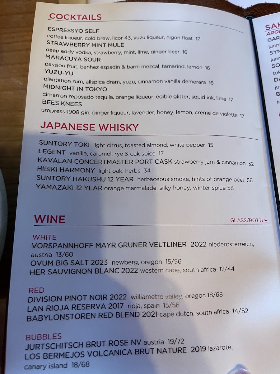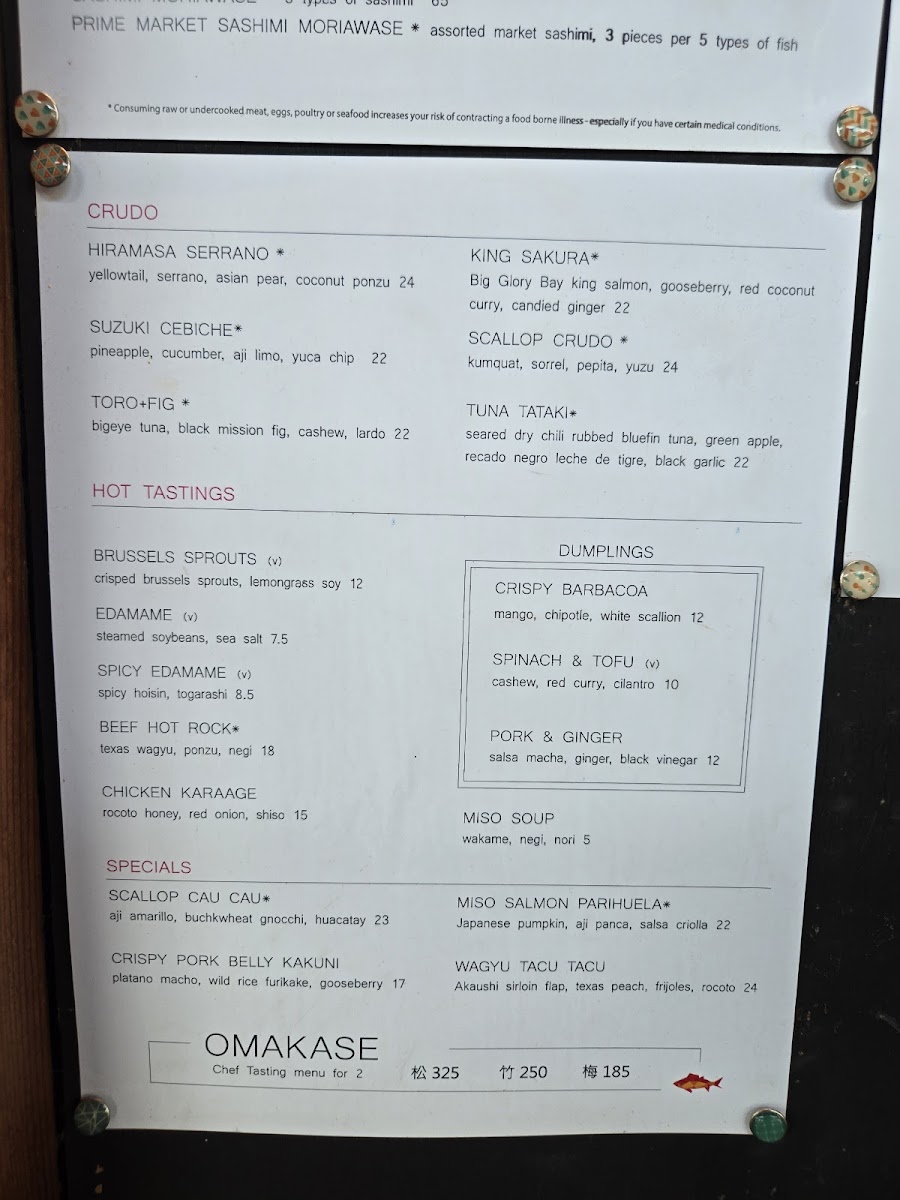 *PLEASE ALLOW 60 MINUTES TO PREPARE* 15 pieces of nigiri - 5 Maguro, 5 Sake, 5 Hiramasa Two chef's choice market sashimi, 3pc each 1 hiramasa serrano - dutch yellowtail, asian pear, black tobiko, serrano, cilantro, coconut water ponzu ...